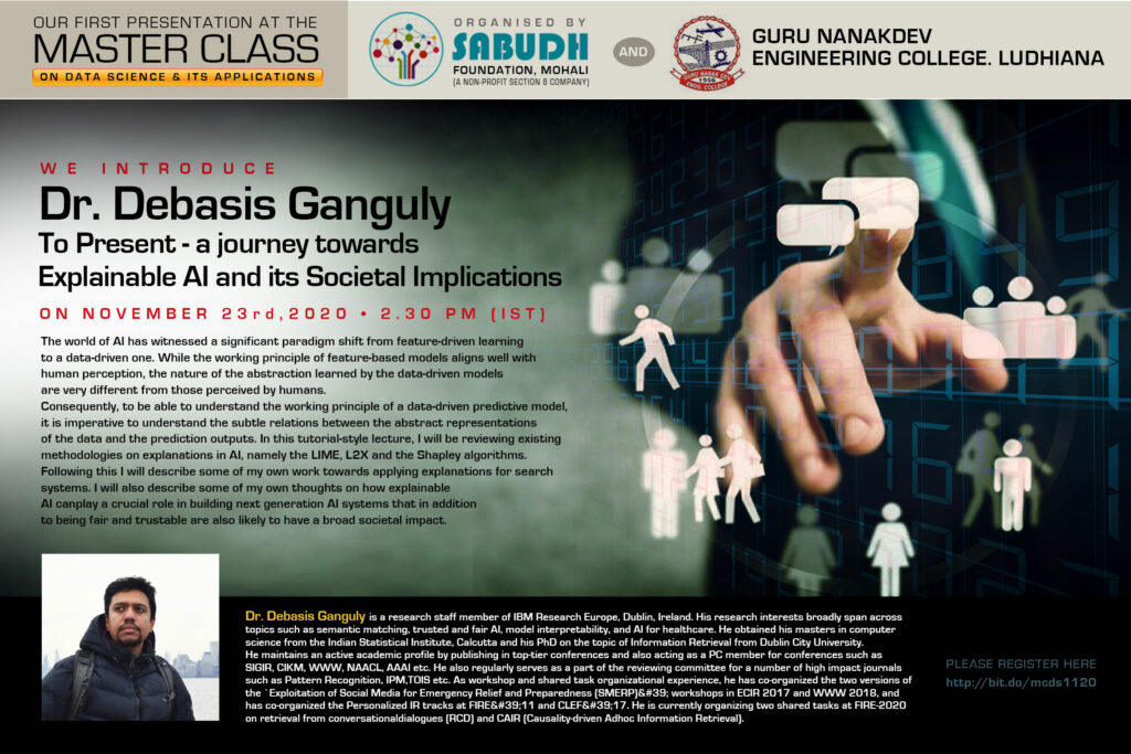 A Journey towards Explainable AI and its Societal Implications 23rd November, 2020 Debasis Ganguly is a research staff member of IBM Research Europe, Dublin, Ireland. His research interests broadly span across topics such as semantic matching, trusted and fair AI, model interpretability, and AI for healthcare. He obtained his masters in computer science from the […]